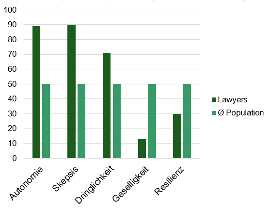 Wie liest sich diese Darstellung? Die hell-grünen Balken repräsentieren die durchschnittlich starke Ausprägung der Persönlichkeitsmerkmale aller untersuchten Probanden. Die dunkel-grünen Balken stehen für die Anwälte. Sie sehen schon: Wir streben viel stärker nach Autonomie als andere. Dies zahlt natürlich ein auf unser stark verbreitetes Selbstbild, wonach wir – auch wenn in Kanzleiteams eingebunden – letztlich als Einzelkämpfer unterwegs sind. Weiter fällt auf, dass wir bedeutend skeptischer sind als andere Professionals. Dies ist zweifellos eine gesunde Ausprägung dieses Persönlichkeitsmerkmals von Anwälten. Auch beim Thema Dringlichkeit – Wolfgang Weiss hat diesen Begriff einmal übersetzt als „Ich will alles, und ich will es sofort!“ – unterscheiden wir uns deutlich von allen anderen. Soweit, so gut. Autonomie, Skepsis und Dringlichkeit sind wichtige Eigenschaften, die uns helfen, unsere Arbeit im Dienste unserer Mandanten gut und engagiert zu erledigen.
